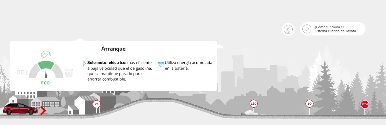 Nuestros híbridos han sido diseñados para que sea tan fácil conducirlos como sea posible. Al pulsar el botón de arranque no se oye ningún ruido, ¡tan solo un aviso de que ya estás listo! Y, puesto que el sistema híbrido se controla a sí mismo, y que todos los híbridos son automáticos, bastan con poner la palanca en Drive y disfrutar de una potencia sin fisuras en cada trayecto.