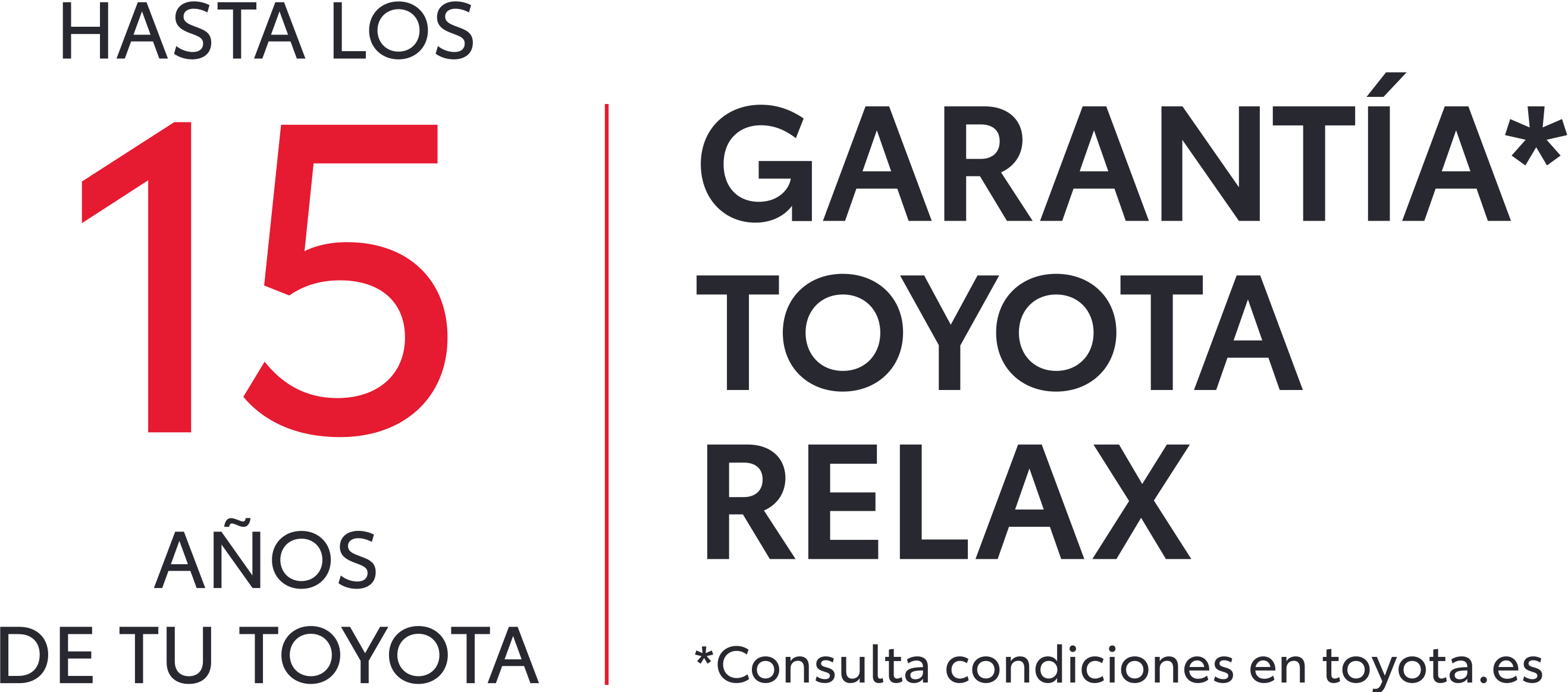 Garantía Toyota Relax, hasta los 15 años o 250.000 kms de tu Toyota renovable año a año. Consulte términos y condiciones en www.toyota.es. Modelo visualizado puede no corresponder con el modelo ofertado. Oferta válida hasta 08/01/2026 en Península y Baleares. Promoción no acumulable a otras ofertas o descuentos. Quedan excluidos de esta promoción los vehículos para flotas. Oferta ofrecida por Toyota España S.L.U. (Avda. Bruselas, 22. 28108 – Madrid) y su red de concesionarios. Para más información consulte condiciones en tu concesionario habitual o en toyota.es Los niveles de consumo de combustible así como de emisiones de CO2 se miden en un entorno controlado, de acuerdo con los requisitos de la normativa Europea. Datos de consumo eléctrico provisionales, pendientes de homologación final. Sujetos a posibles variaciones. Para más información o si está interesado en los valores de un vehículo con distinto acabado, por favor contacte con Toyota España, S.L.U. o su concesionario Toyota. El tipo de conducción junto con otros factores (condiciones de carretera y meteorológicas, tráfico, conducción del vehículo, equipo instalado después de la matriculación, carga, número de pasajeros, etc.) juega un papel en el consumo de combustible y emisiones de CO2.